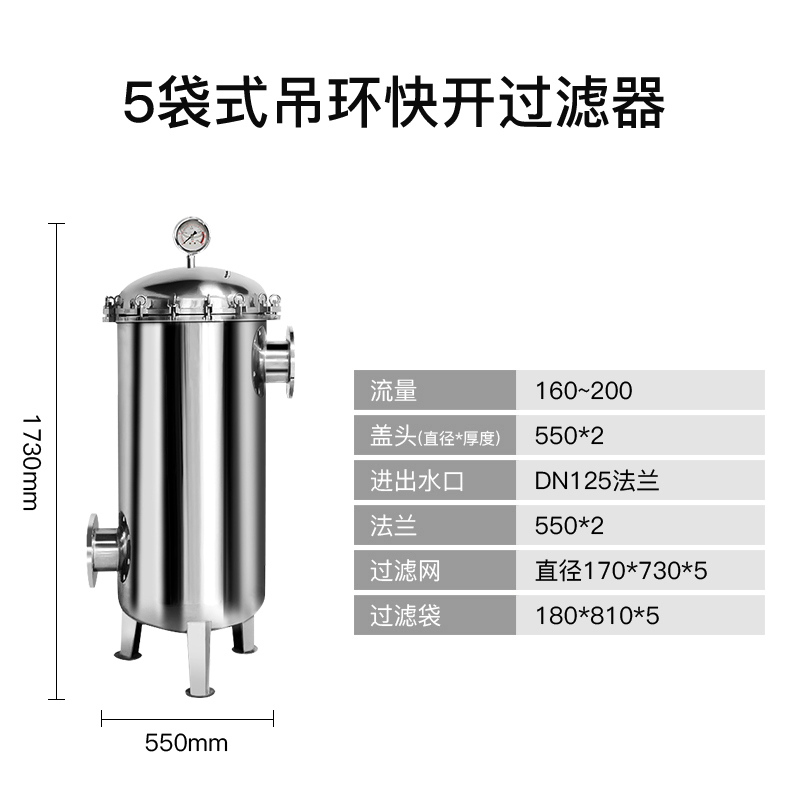內外鏡麵拋光或噴砂亞光處理。多袋式過濾(lǜ)器、PP(多(duō)袋)碳鋼多袋式(shì)過濾(lǜ)器(qì)主要用於過濾水,飲料,化學液體中的雜質,常規濾袋類型有1#、2#,多(duō)袋式過濾器內有不鏽鋼濾籃作為支撐,這樣的過濾器過濾麵積大,過濾效果好,並且帶搖臂、吊環螺栓的打開方式很方便,有效降低了大流量過濾的成本。水(shuǐ)流量可以達到10m²/h到1080m²/h -